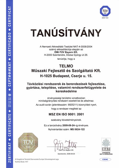 A TELMO Kft. 2003. július 31-tõl bevezette az ISO 9001: 2000 minõségirányítási rendszert.